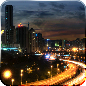 Moving clouds and streaks from the traffic enhance this beautiful long-exposure image of a city at night. Has full support for both portrait and landscape viewing, and responds to home screen switching! Lots of preferences for speeds, sky colors, time-of-day cycling, and more.